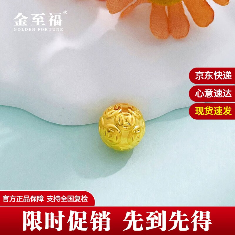 包邮 金至福铜钱纹黄金转运珠女财源广进足金珠子送女友送男友本命年生日礼物 单颗金珠 约0.9克 (多退少补)不配证书不配首饰盒